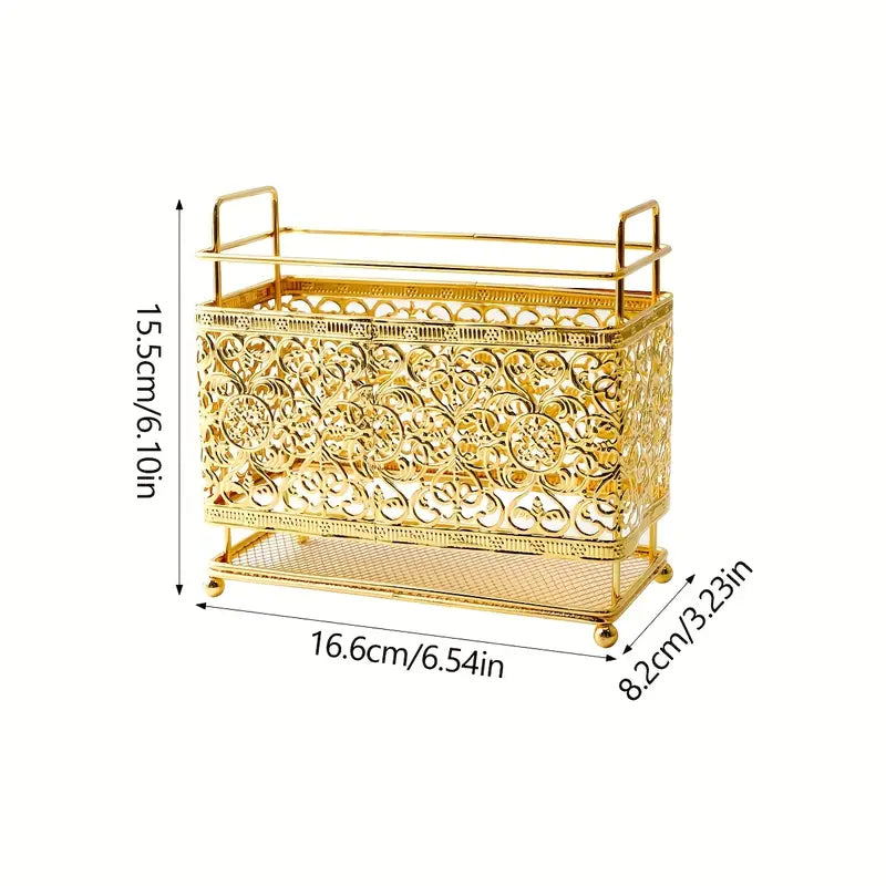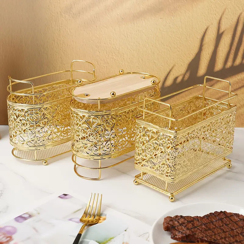 Cast Iron Utensil Holder with Wooden Base – Elegant Hollow-Out Multi-Functional Kitchen Organizer